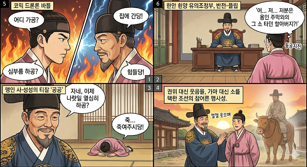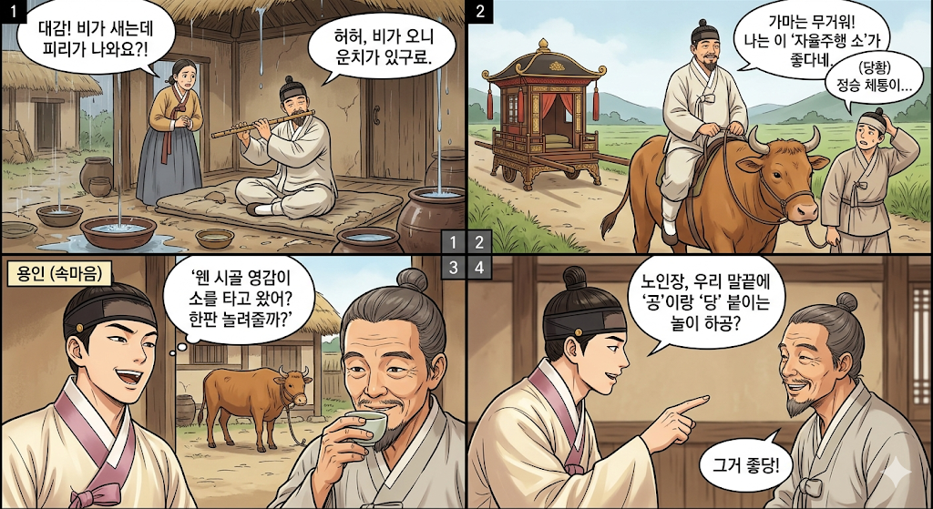 맹사성: “웃으라지. 소는 힘도 세고, 느릿느릿 풍경 구경하기도 딱 좋단다. 이게 바로 조선의 ‘자율주행’ 아니겠느냐?”