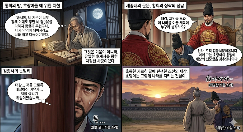 여러분, 혹시 지금 나를 유독 힘들게 하는 직장 상사나 선생님이 있나요? 물론 그냥 나쁜 사람일 수도 있지만(ㅠㅠ), 어쩌면 그분은 여러분 안에 있는 ‘호랑이’를 발견하고, 여러분이 더 큰 무대에서 다치지 않게 미리 훈련시키고 있는 ‘황희’일지도 모릅니다.